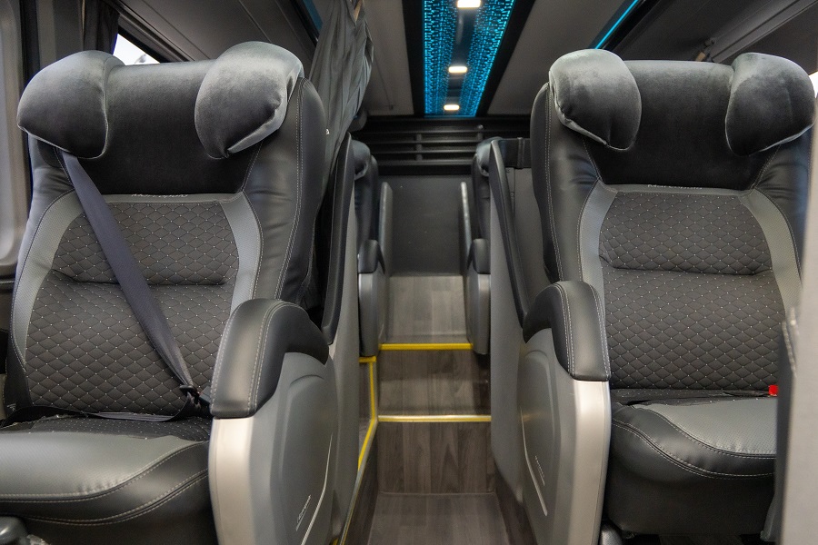 Tomadas 110V, cortinas entre poltronas, sistema de acessibilidade com DPM, ar-condicionado quente/frio com defroster na cabine do motorista.