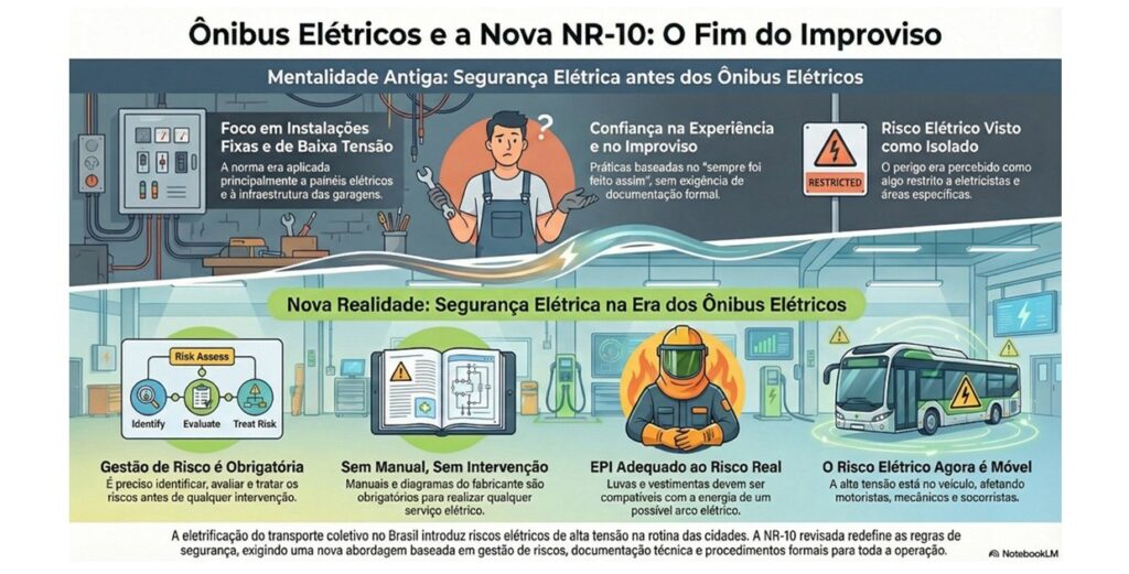 Historicamente, a NR-10 era vista como uma norma voltada principalmente a eletricistas industriais, subestações e instalações prediais. No setor de ônibus, sua aplicação era indireta e, muitas vezes, limitada a painéis elétricos convencionais, sistemas de baixa tensão e infraestrutura predial das garagens.