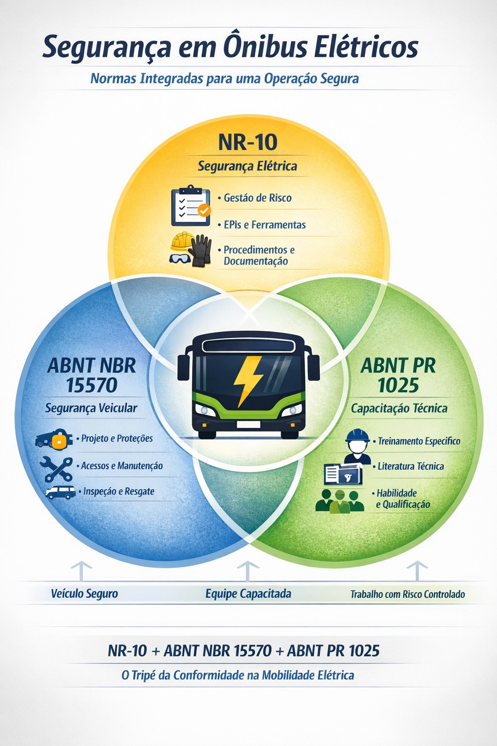 Se a NR-10 define as obrigações legais e a ABNT NBR 15570 estabelece como o ônibus elétrico deve ser projetado para ser seguro, a ABNT PR 1025 ocupa um papel decisivo: ela traduz essas exigências em critérios práticos de trabalho seguro em veículos eletrificados.