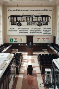 Em caso de choque elétrico ou arco elétrico durante recarga ou manutenção, a análise judicial tende a se concentrar em quatro pilares: