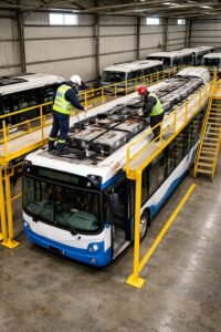 - Identificação da frente: “Manutenção de pack de baterias no teto de ônibus elétrico – garagem X”.