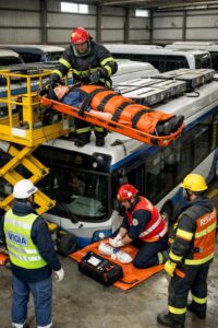 Resumo: a nova NR-10 + NR-35 transforma o que era “acidente de trabalho” em evidência de gestão de risco falha, facilitando condenações. Empresas de transporte elétrico já estão sendo autuadas com valores altíssimos exatamente por baterias no teto sem passarelas e sem resgate estruturado.