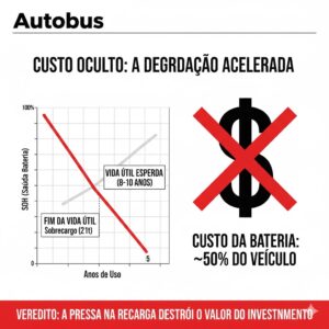 Além dos riscos humanos, a tentativa de “ganhar tempo” carregando veículos superaquecidos e sobrecarregados destrói o retorno sobre o investimento (ROI). O banco de baterias é o componente mais caro do ônibus elétrico, representando até 50% do seu valor total. Sua vida útil é medida pelo SOH (State of Health), que é severamente degradado por dois fatores presentes na operação de São Paulo: