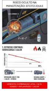 A manutenção preventiva exige testes de continuidade, inspeção de conectores e, muitas vezes, o manuseio de ferramentas metálicas em áreas próximas aos módulos de bateria. Como demonstrado, o excesso de peso causa vibrações e microfissuras estruturais. Se o veículo estiver conectado ao carregador, qualquer falha de arco elétrico não será apenas um “curto-circuito da bateria”, mas sim um arco alimentado pela rede elétrica da garagem, com potência suficiente para vaporizar componentes e causar óbito instantâneo ao técnico, violando frontalmente a NR-10.