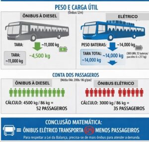 - Cenário B (Ineficiência): O ônibus circula respeitando a balança, mas transporta muito menos gente. Isso obriga a prefeitura a colocar mais ônibus nas ruas para suprir a demanda, o que aumenta o custo da passagem e o trânsito.