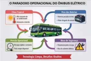 Como ilustra o infográfico “O Paradoxo Operacional do Ônibus Elétrico”, diferentes fatores técnicos se combinam para moldar o desempenho real desses veículos no ambiente urbano