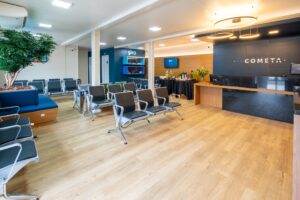 Desenvolvida a partir da estrutura de um contêiner, um formato inovador no setor rodoviário, a Sala VIP da Cometa conta com banheiros, ar-condicionado, terminais digitais para uso dos clientes e cadeiras que comportam até 40 pessoas simultaneamente. O espaço, também, foi planejado para atender passageiros com cadeiras de rodas, garantindo a acessibilidade.